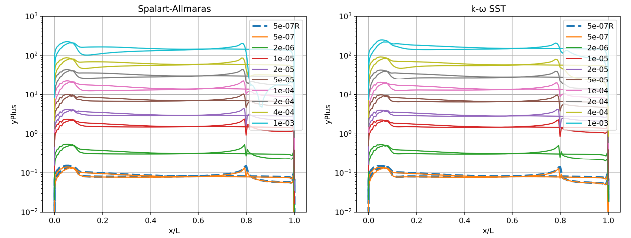 Fig. 5.5.3 Y+ values along the flat plate for wall-resolved (R) and wall-model simulations for the Spalart-Allmaras and \(k-\omega\) SST turbulence models.#