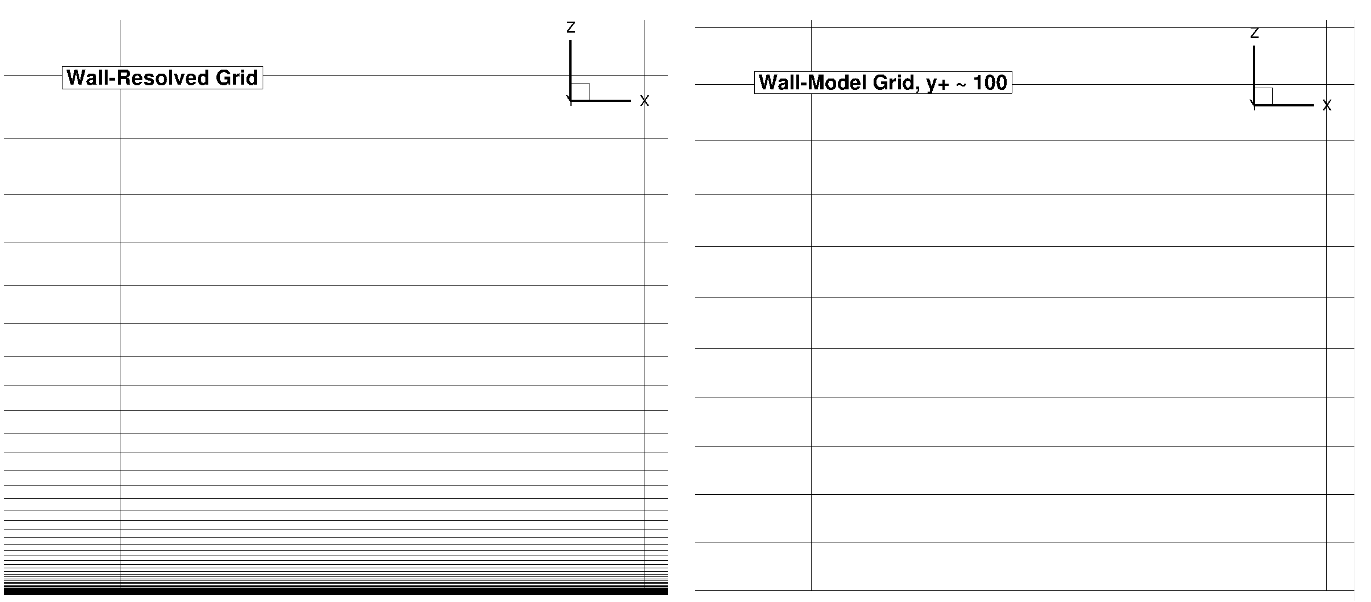 The first case under consideration is the flat plate case, which is a canonical case often used for testing new implementations in CFD. The flat plate case is based on the model verification case available on the NASA TMR website. The freestream Mach number is equal to 0.2 with the Reynolds number per unit length equal to 5 million. The boundary conditions applied are based on the Flat Plate TMR Case, with the NoSlipWall boundary condition replaced with WallFunction for the wall model cases. The grids were generated based on the 137 by 97 nodes grid from the NASA TMR flat plate grids download page. This grid was loaded into a meshing tool and the wall spacing was modified to a number of values ranging from 4e-07 to 2e-03 to examine the effect of different \(y^+\) values on the results. The wall resolved and wall model grids for a target \(y^+\) value of 100 are compared in Fig. 5.5.1.
