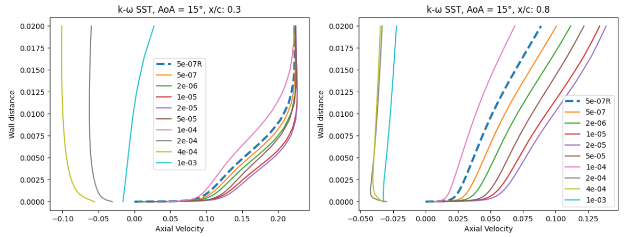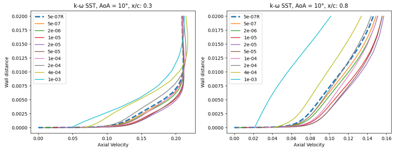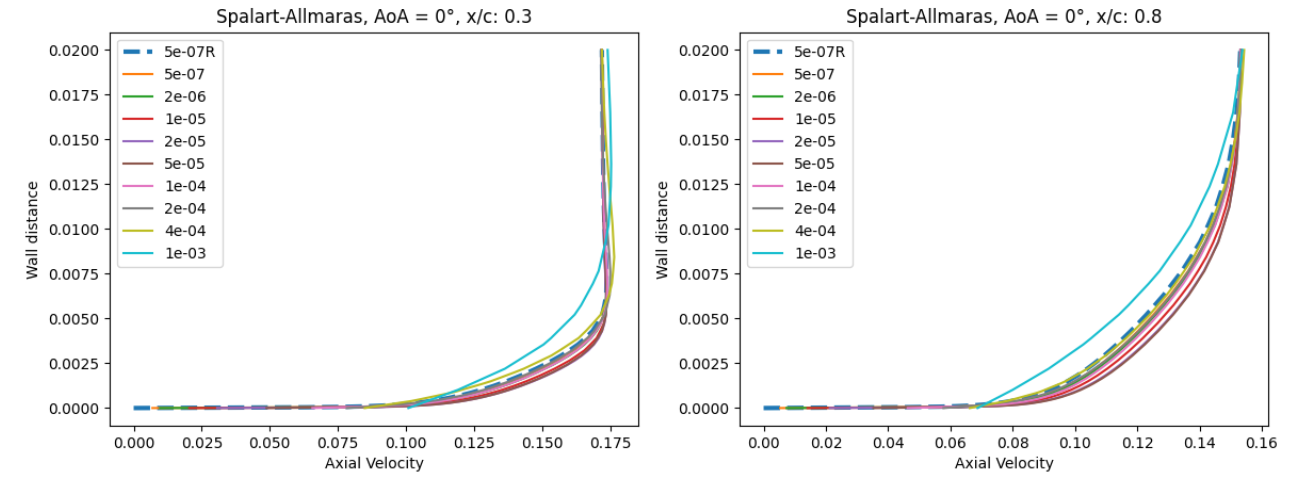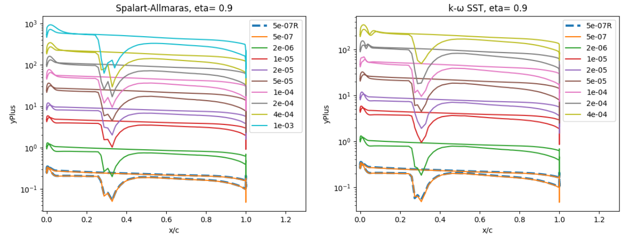 As the wall spacing increases, the drag value is minorly underpredicted compared to the wall-resolved simulations, with the difference staying within 10% for the first two wall spacings. As the wall spacing is increased further, the error on the drag prediction increases, until spacings of 0.0002-0.0004 are reached, above which the error significantly reduces. Similar trends are observed between the Spalart-Allmaras and \(k-\omega\) SST turbulence models, although the error on the drag prediction appears to be slightly higher for the \(k-\omega\) SST turbulence model across nearly all wall spacings. At very high wall spacings, the \(k-\omega\) SST model appears to perform better than the Spalart-Allmaras model. To analyse these findings further, we first look at the \(y+\) and skin friction distributions, shown in Fig. 5.5.3-Fig. 5.5.4. A boundary layer profile in wall units according to the Law of the wall is also shown in Fig. 5.5.5 to aid the discussion.