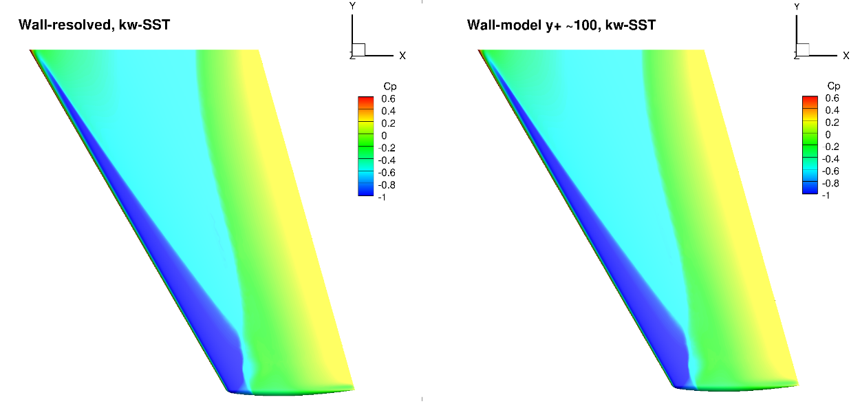 The use of the wall model typically has minor impact on the surface pressure prediction, but will lead to an error on the skin friction distributions. Generally, however, the skin friction trends are well captured based on the examined cases.