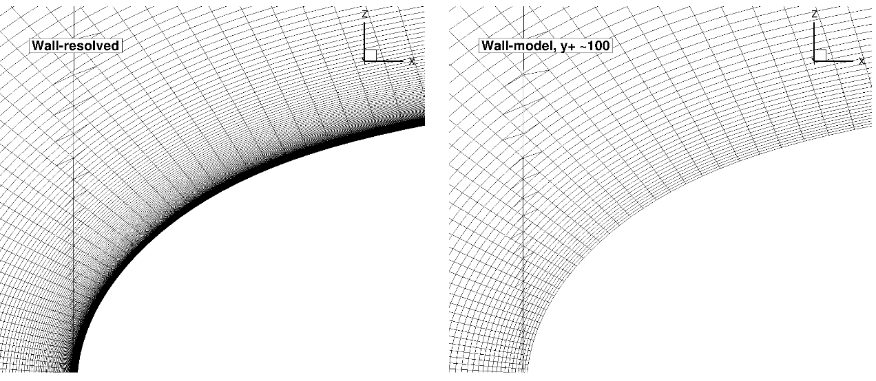 Fig. 5.5.9 Comparison of the wall-resolved (left) and wall-model (\(y^+\) ~100 (right) grids for the NACA0012 case.#