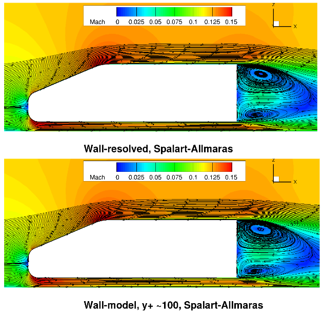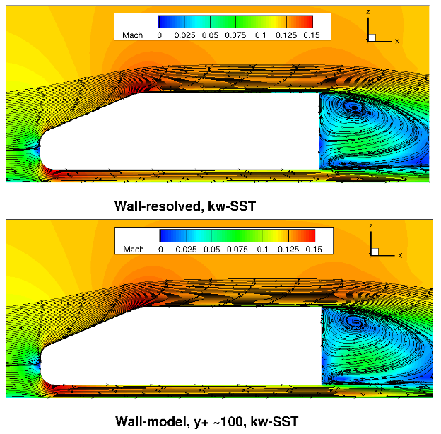 Qualitatively, the flowfield streamlines show excellent agreement between wall-resolved and wall-modeled simulations for both examined turbulence models. Although the flow at the back of the car, was not the focus of this study, similar flow features are observed with a larger and smaller recirculation region present. The highly consistent flowfields highlight the applicability of the wall model to automotive applications.