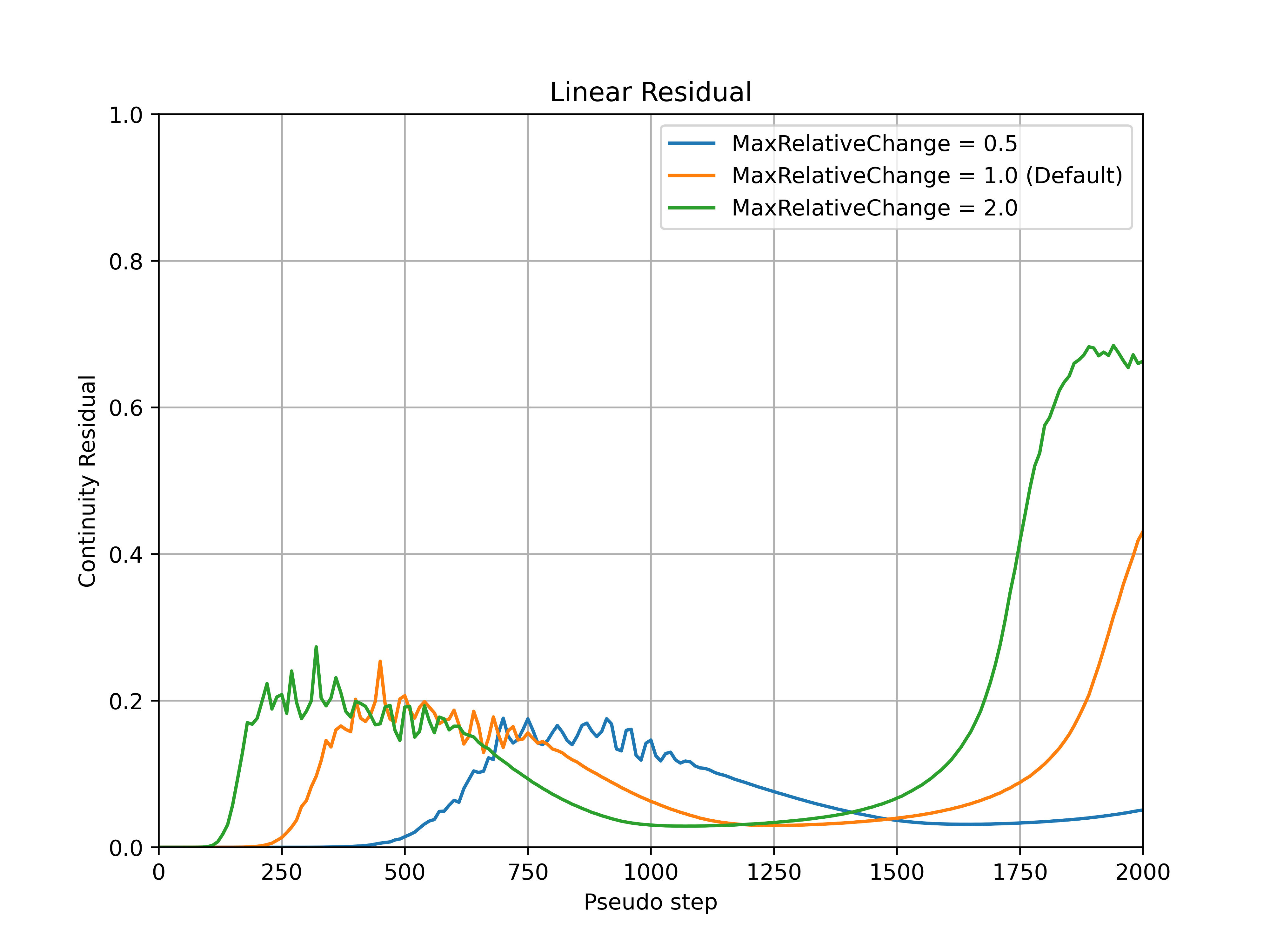 Continuity linear residual convergence during the simulation for a range of max_relative_change values.#