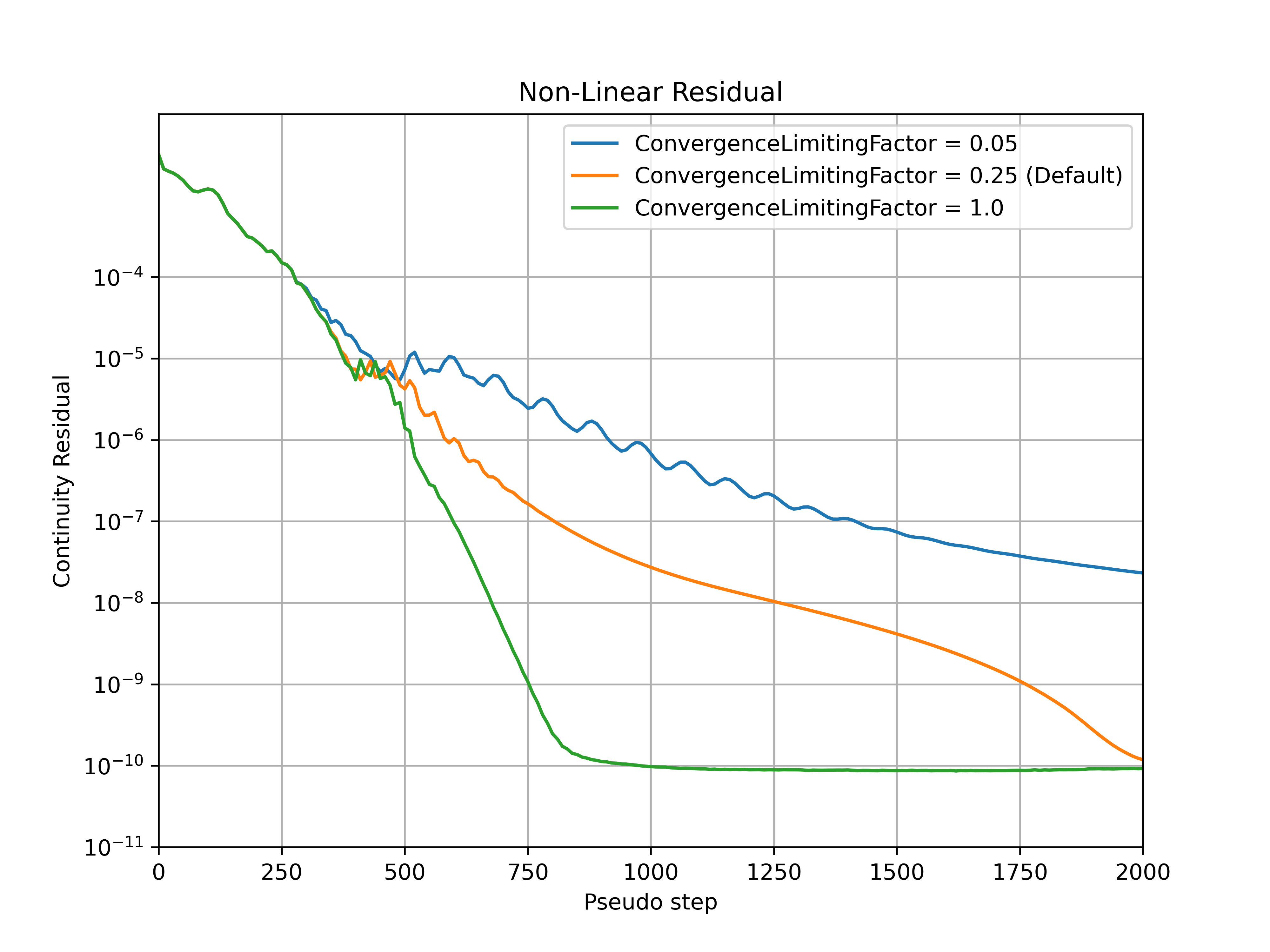In the case of simulation divergence, it is recommended to reduce the value of convergence_limiting_factor (after checking the mesh quality at the divergence location, see General Recommendations.
