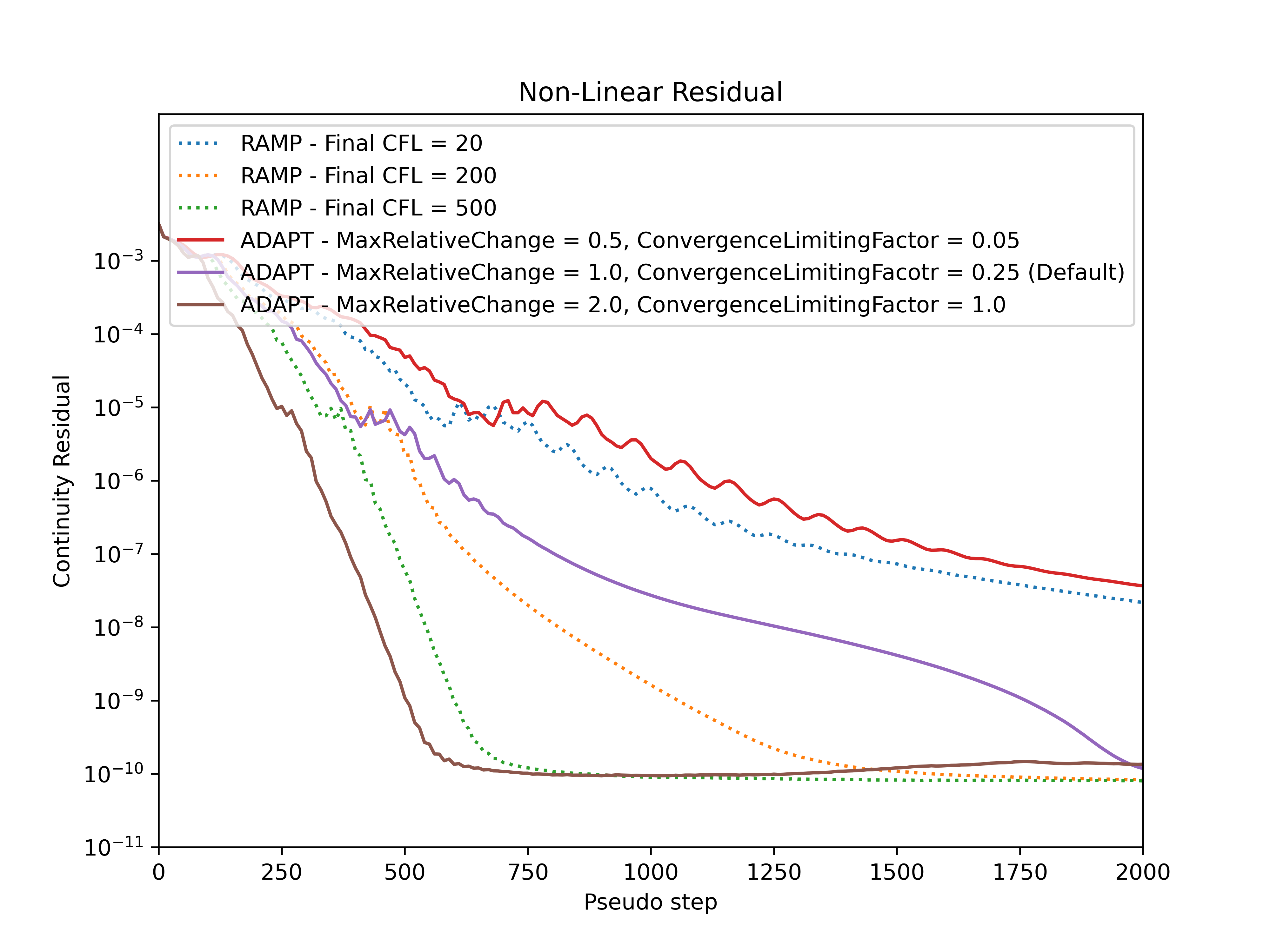 This approach adaptively adjusts the CFL number with criteria based on the linear residual values. The AdaptiveCFL ramping approach offers several advantages when compared to RampCFL: