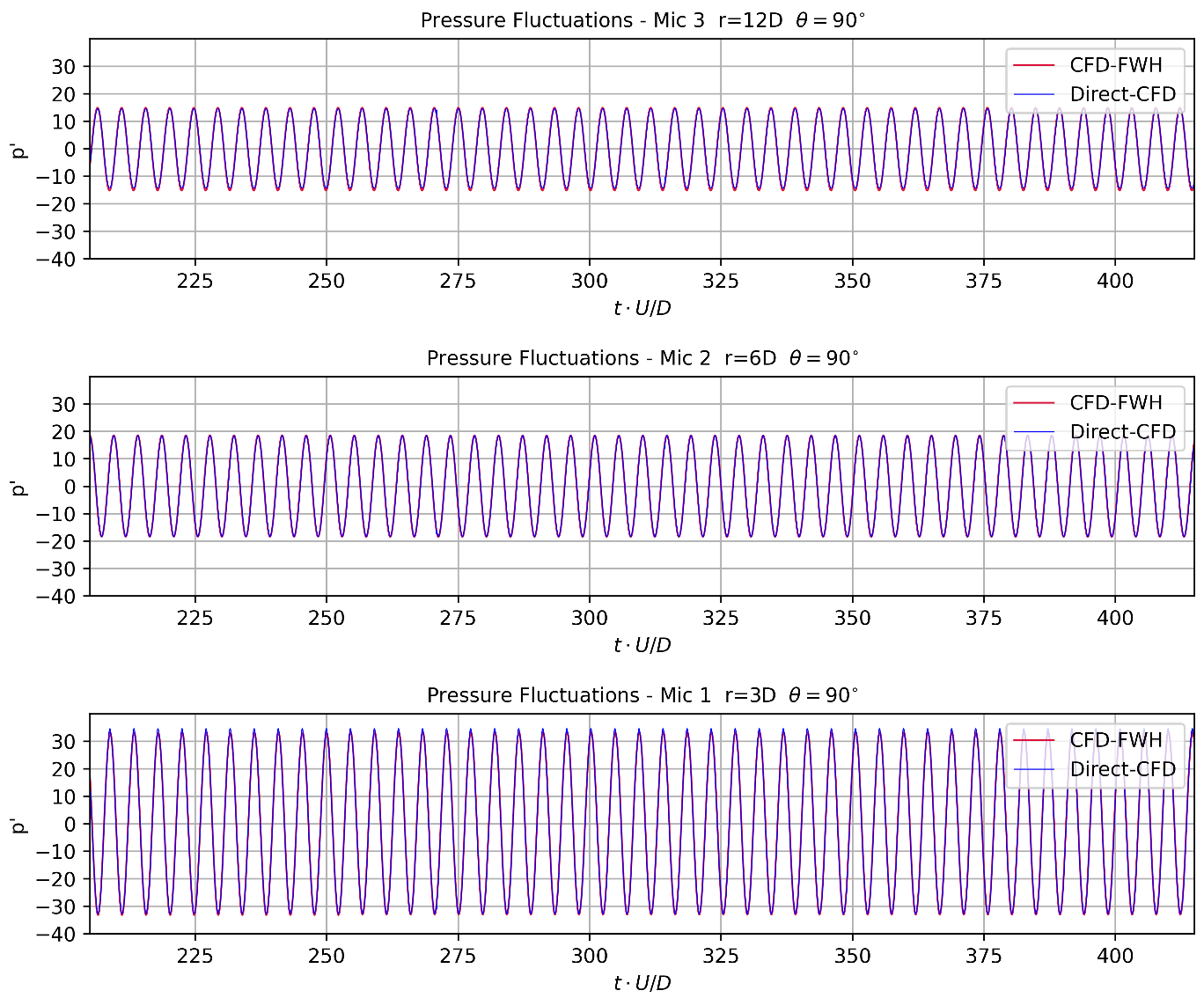 Meanwhile, the pressure fluctuations at three microphones at the same angle are illustrated in Pressure fluctuations for microphones at the same angle for the cross flow over the circular cylinder. Frequency alignment is observed for all three radial microphones, with a slight mismatch in amplitude at microphone 3 due to mesh coarsening. Furthermore, a \(p^{\prime}\) scaling proportional to \(1/\sqrt{r}\) is achieved. The internal consistency test is successful.
