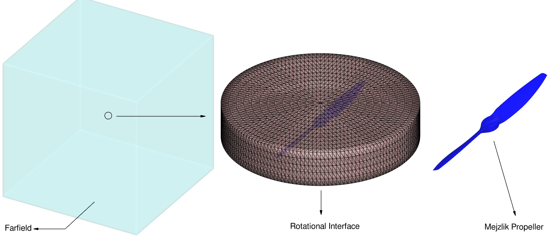 This study considers two operating conditions, representing hover and forward modes, with freestream velocities of \(0\) and \(15 m/s\). The CFD domain and the specified boundary conditions are illustrated in Summary of boundary conditions for the two-bladed Mejzlik propeller..