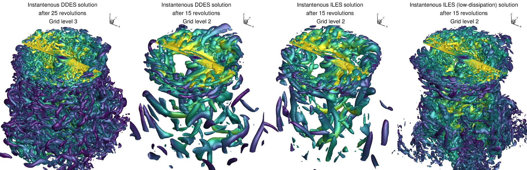 In Comparison of instantaneous velocity contours in hover mode for ILES and DDES simulations for the Mejzlik propeller., instantaneous velocity contours at the middle slice are presented for both Implicit Large Eddy Simulation (ILES) and Delayed Detached Eddy Simulation (DDES) approaches. On the left side, the DDES solution on the extra fine mesh (level 3) after 25 revolutions is displayed. This represents the longest simulation on the finest mesh. Next, the DDES solution on the fine mesh (level 2) after 15 revolutions is shown. In comparison to the DDES solution on grid level 3, the vortices are more resolved in the near-field region, which is attributable to the presence of a finer mesh in the wake region. Moreover, the wake is more dissipated downstream after 2D, which stems from the mesh resolution difference between level 2 and 3. On the right side, the DDES solution on grid level 2 is compared with the ILES solution on the same grid level after 15 revolutions. The comparison of instantaneous vortical structures for both solutions on the same grid level after the same number of revolutions reveals fair similarity. Finally, the instantaneous ILES solution on grid level 2 after 15 revolutions is presented. The vortical structure in the wake region for this solution is notably similar to the DDES solution on grid level 3. The vortices are well-resolved in the wake region for the low-dissipation simulation on grid level 2. This indicates that employing the low-dissipation scheme enhances the ability to resolve turbulence in both space and time for a transient simulation. The iso-surface of the Q-criterion for different instantaneous solutions is shown in Comparison of iso-surface Q-criterion in hover mode for ILES and DDES simulations for the Mejzlik propeller.. It reveals some separation on the upper surface, even though this is the RANS region of the DDES, and confirms the different resolution of turbulent eddies seen earlier.