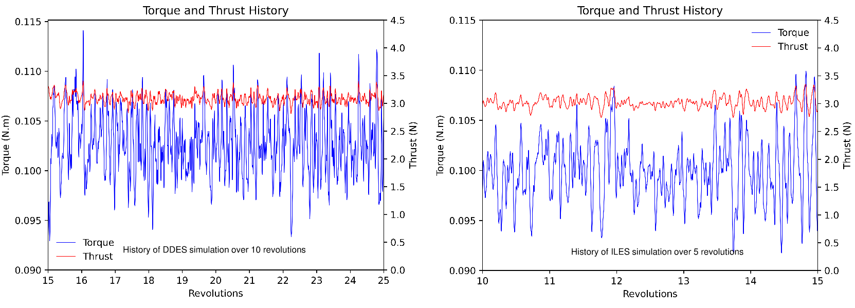 In Comparison of the history of aerodynamic loads in hover mode for ILES and DDES simulations for the Mejzlik propeller., the history of aerodynamic loads are compared between Delayed Detached Eddy Simulation (DDES) and Implicit Large Eddy Simulation (ILES). For the DDES simulation, aerodynamic loads are monitored for the last 10 revolutions, while for the ILES simulation, they are monitored for the last 5 revolutions. The DDES simulation is initiated after two consecutive initial simulations. Firstly, a first-order simulation is conducted for 5 revolutions, followed by a second-order simulation for 10 revolutions. Finally, the DDES simulation begins from the solution obtained in the second-order run and lasts for 10 revolutions. The ILES simulation starts after one initial simulation. Initially, a first-order simulation is performed for 5 revolutions, and then the ILES simulation begins using the first-order solution, lasting for 10 revolutions. The aerodynamic loads are averaged over the last 5 revolutions. The comparison in this figure reveals that variations in torque and thrust after the initial 10 revolutions are similar. Therefore, it is considered that the initial 10 transient revolutions are sufficient to initiate an unsteady run and average the aerodynamic loads.