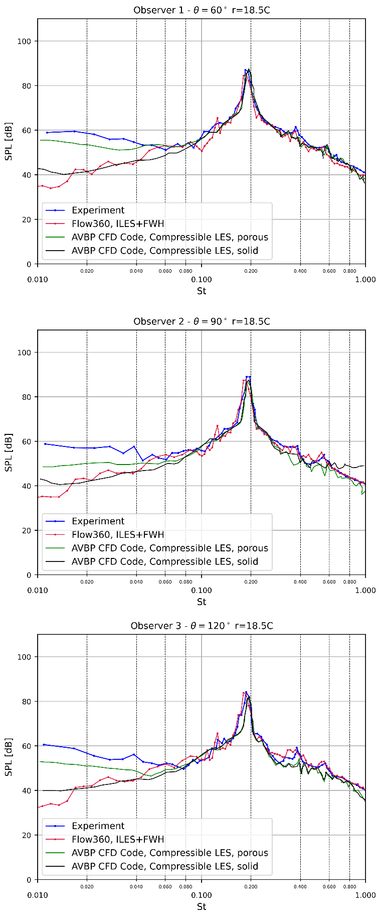 The Strouhal peak is effectively captured for the two source surfaces. The computed Strouhal number based on the Sound Pressure Level (SPL) spectra for three observers is \(St=0.186\), which is in good agreement with the experimental value of \(St=0.19\). However, a more noticeable discrepancy at higher frequencies is observed, particularly at the downstream microphone (\(\theta\) =60 °). This test case underscores the reliability of acoustic simulation using Flow360 with an Ffowcs-Williams and Hawkings (FWH) acoustic analogy for predicting noise in a rod-airfoil configuration. The compressible Implicit Large Eddy Simulation (ILES) with a low-dissipation scheme on an unstructured mesh allows for high-fidelity resolution of acoustic sources and their propagation. The FWH analogy efficiently extrapolates the pressure field in the far-field region at a relatively small computational cost. Meanwhile, the CFD-FWH method proves effective in predicting both the tonal and broadband components of the sound generated by the rod-airfoil configuration.