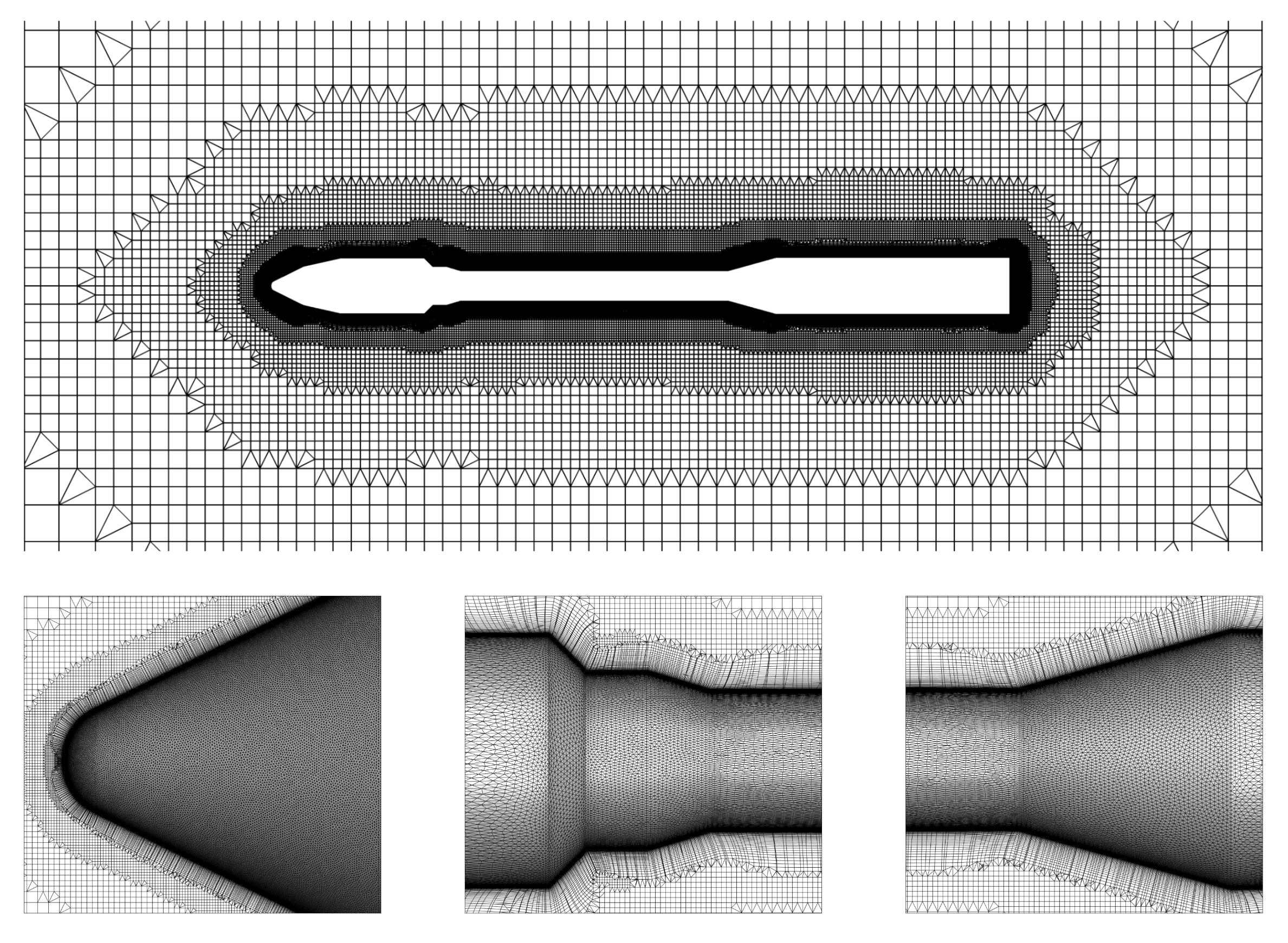 To ensure a consistent basis for comparison, the numerical simulations were performed at the same freestream conditions reported in the wind-tunnel experiments [1]. The computational domain was generated using an automated procedure and extended to a size approximately 100 times larger than the largest length of the vehicle, minimizing errors associated with wave reflections at the far-field boundaries.