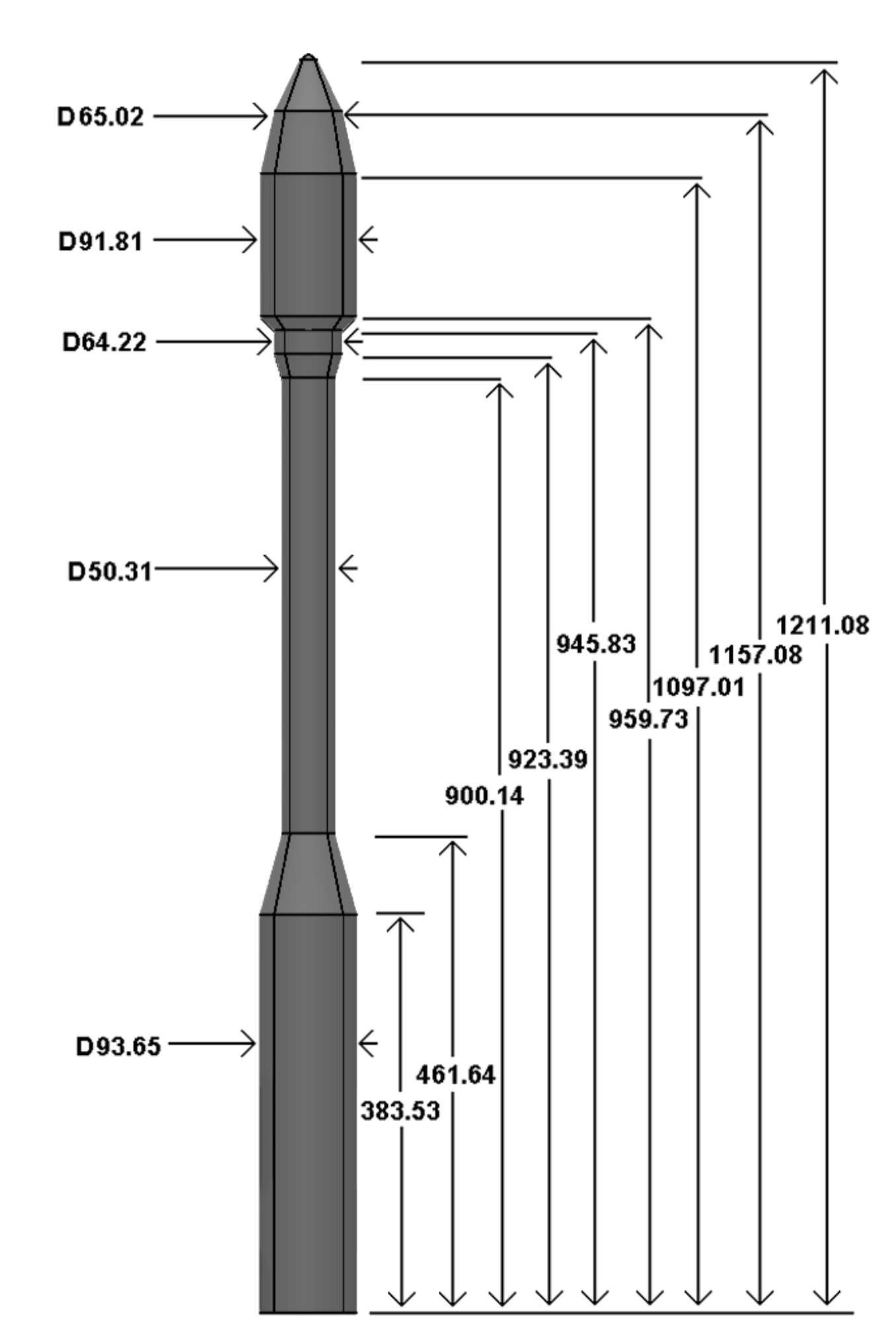 The configuration consists of a first-stage booster with a constant diameter, followed by an interstage that tapers to a smaller diameter upper stage stack. The payload section is modeled as a biconic fairing with a maximum diameter significantly larger than that of the underlying stages, introducing a rearward-facing step at the fairing interface. This geometric discontinuity is known to generate strong shock–boundary-layer interactions and separated flow regions in the transonic and supersonic regimes, making it a particularly challenging and relevant validation case.