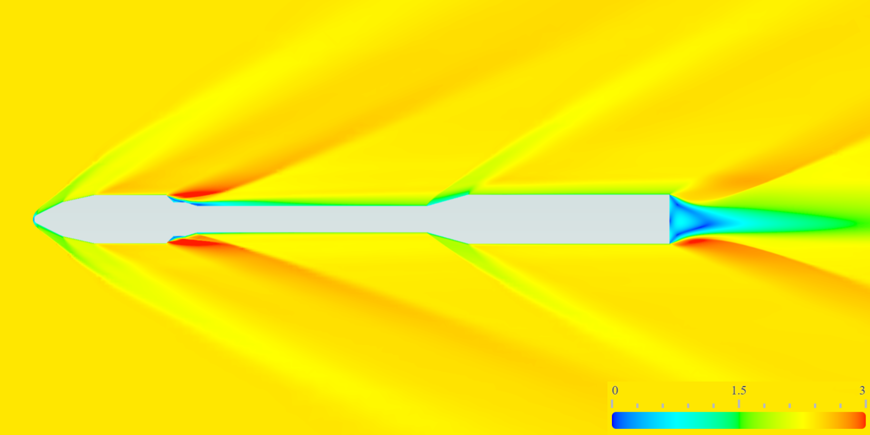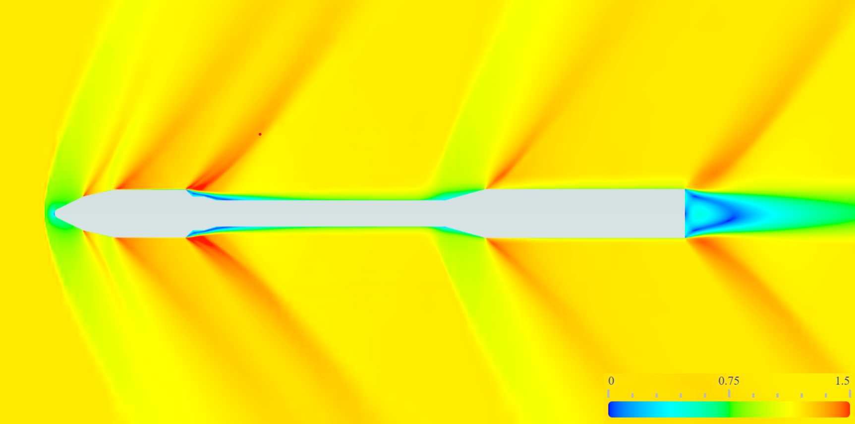 Operating in the transonic and supersonic regimes introduces flow phenomena that are both highly nonlinear and strongly coupled, including shock-induced separation, large pressure gradients, and unsteady wake interactions. These effects can have a significant impact on aerodynamic loads and stability characteristics, particularly for configurations featuring geometric discontinuities such as payload fairings, steps, or diameter changes. Accurately capturing these phenomena places stringent requirements on numerical methods, turbulence modeling, and grid resolution.