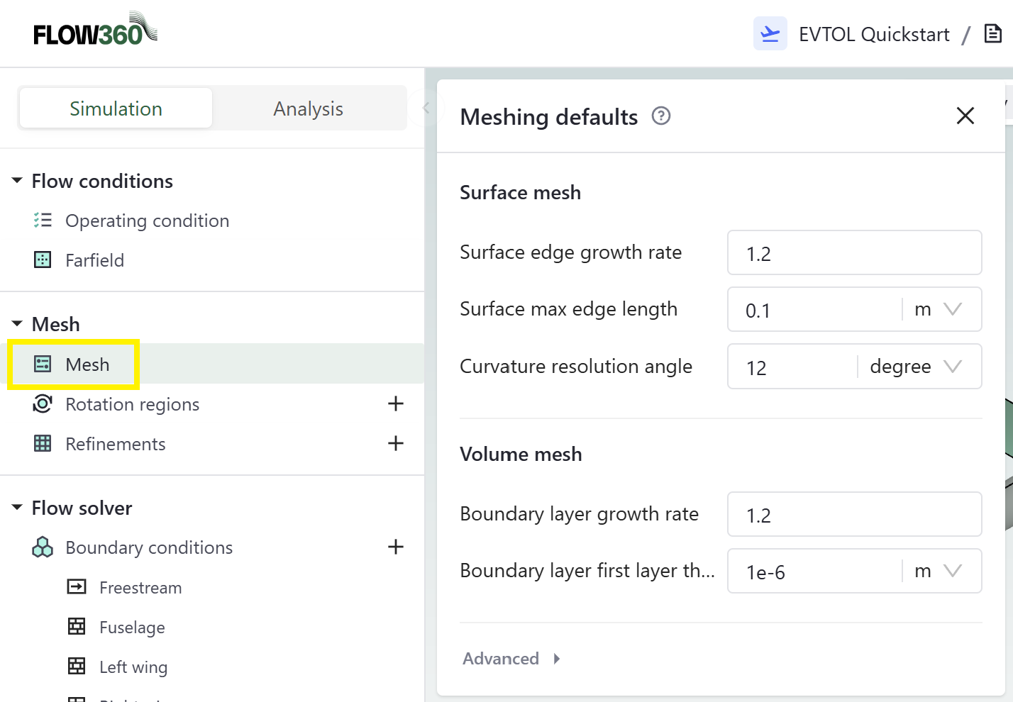 When opening the project that we created in the previous Quick Start tutorial you will notice a Mesh tab on the top left. When clicking on that Mesh tab, a pop up window will appear with the meshing default parameters where you can change them as required to create both a surface mesh and then a volume mesh.