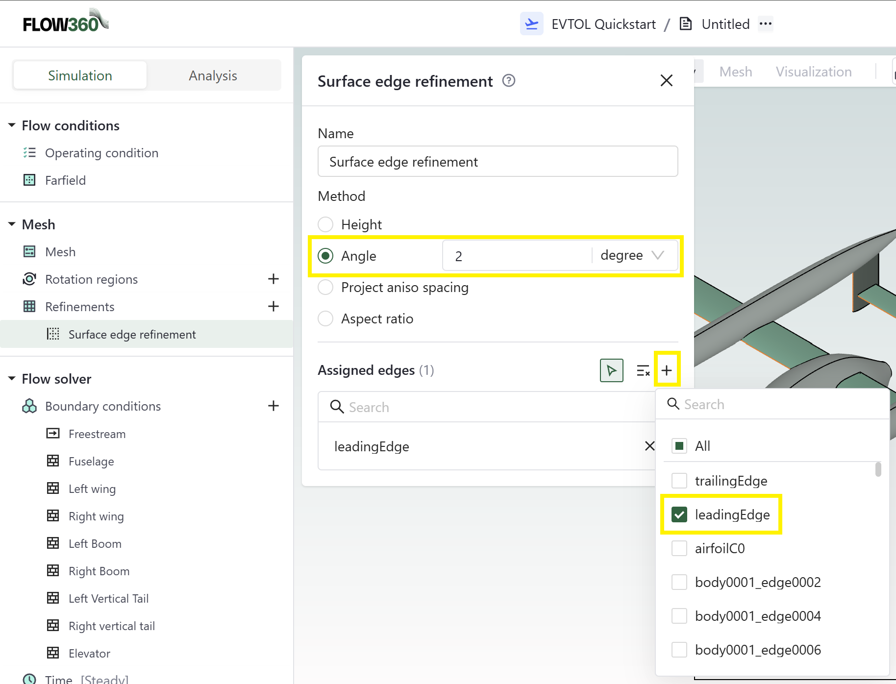 We will also need to specify some leading edge refinements criterion to properly capture the geometry curvature in those regions. Please follow the steps outlined below to specify the leading edge surface mesh criterion of angle 2 ° . As in, force the mesh to refine until it captures all CAD curvature within 2 °.