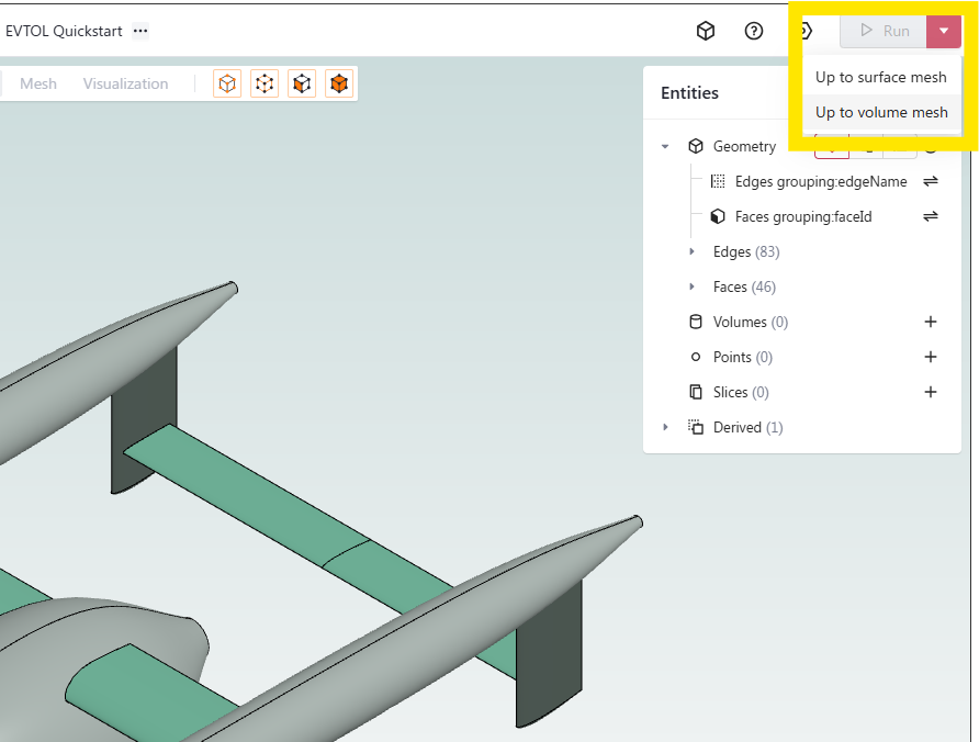 Now that required settings have been defined, you can launch the meshing tool chain. If you look at the Run icon at top right and click on the downwards facing triangle you will notice that you have the option of creating just the surface mesh or both the surface mesh then the volume mesh.