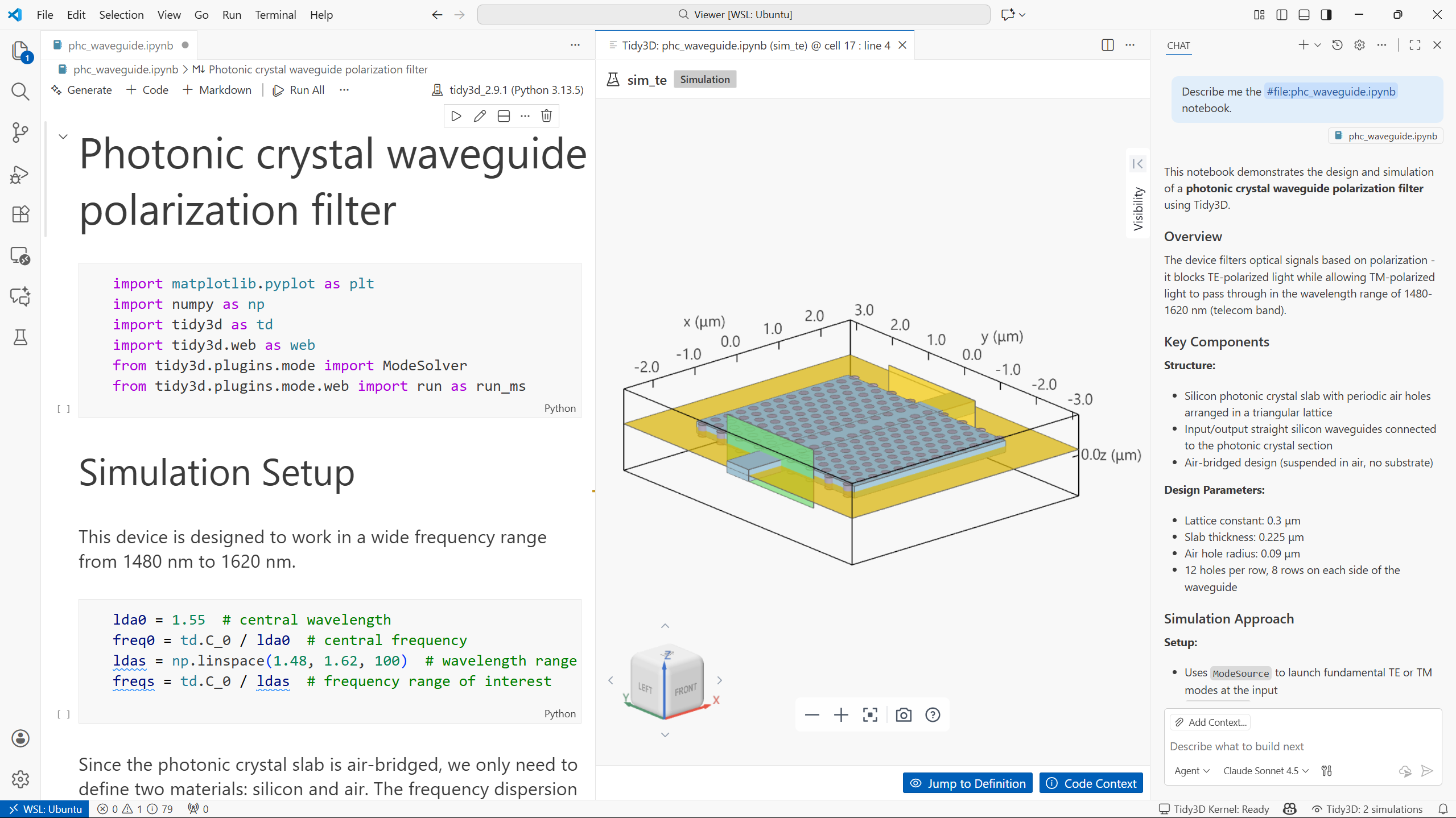 The extension integrates with VS Code GitHub Copilot to provide physics-aware assistance for electromagnetic simulations. Unlike generic coding assistants, this integration understands Tidy3D workflows and can control the 3D viewer.