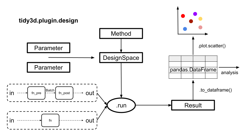 DesignSpaceforms the basis of theDesignplugin, and receives aMethodandParameterlist that define the scope of the design space and how it should be searched.DesignSpace.run()can then be called with a function(s) to generate different solutions from parameters suggested by theMethod. TheMethodcan either sample the design space systematically or randomly, or can optimize for a given problem through an iterative search and evaluate approach.- Parameters: