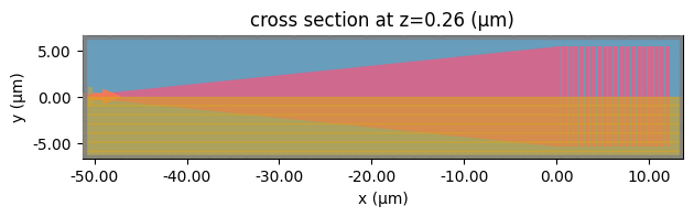 In this notebook, we use the Gaussian beam as the source and use a mode monitor to measure the coupling efficiency. Due to reciprocity, one can use a mode source at the waveguide as excitation and then take the radiated field and do a mode overlap with a Gaussian profile to calculate the same value. In addition, in this setup, one can also perform near field to far field projection by using monitors like FieldProjectionAngleMonitor to investigate he radiation angle of the grating if that’s of interest.