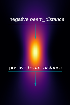 +direction, a positive value ofbeam_distancemeans the beam waist is positioned in the-direction (behind the source). A negative value means the beam waist is in the+direction (in front of the source). For an angled source, the distance is defined along the rotated propagation direction.